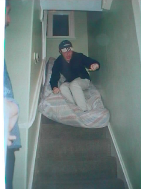 Now for the highlight of the evening.... Stair Mattress Surfing.